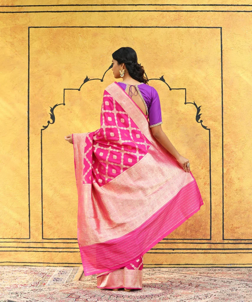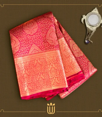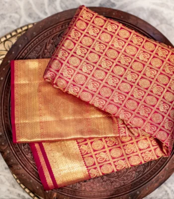 Behold the exquisite masterpiece of the loom: a resplendent Kanchipuram saree in a mesmerizing crimson hue. Every thread of this ethereal silk marvel has been meticulously hand-woven, with a symphony of golden zari embellishments adorning its entirety. Enveloped in the lustrous embrace of shimmering golden zari, this saree is destined to transcend generations.